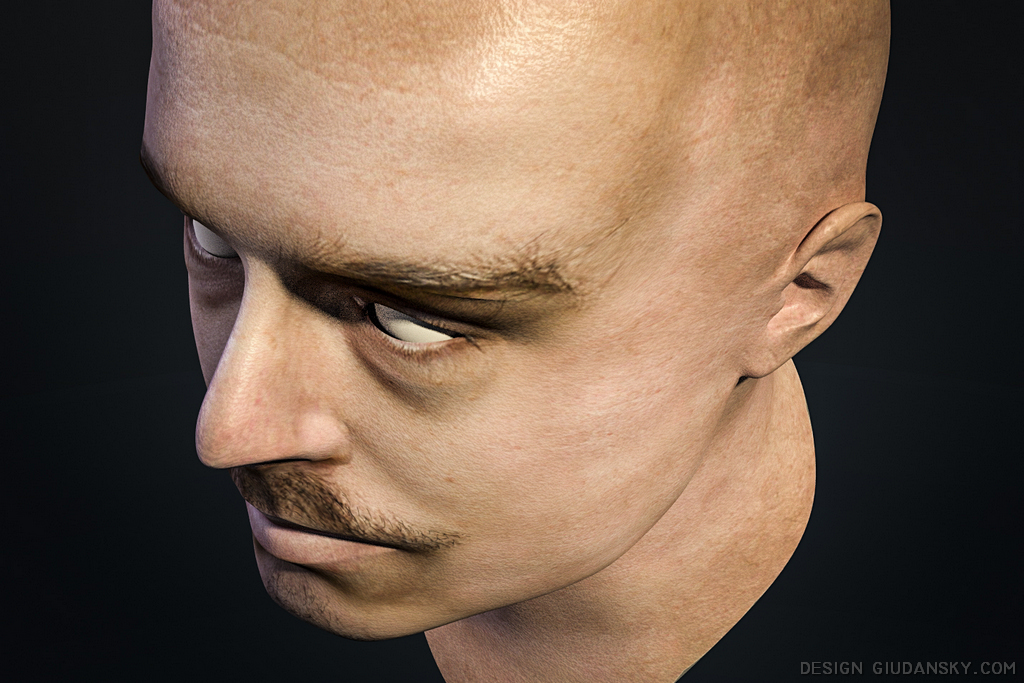 Il passo successivo è quello della mappatura e applicazione del materiale. Anche se ho fatto qualche esperimento con la pelle "reale" del soggetto, l'idea era quella di utilizzarlo per un qualcosa di diverso. Le venature sono tratte da fotografie di marmi di Carrara, per la precisione di marmo lunense quello più bianco e brillante utilizzato nell'antica roma. Diverse altre mappe compongono gli effetti di riflessione, rilievo, traslucenza e sporco. Il materiale finale è prodotto da una mappa di circa trenta nodi corrispondenti a livelli di immagini, shaders, gradienti, maschere, curve di correzione.