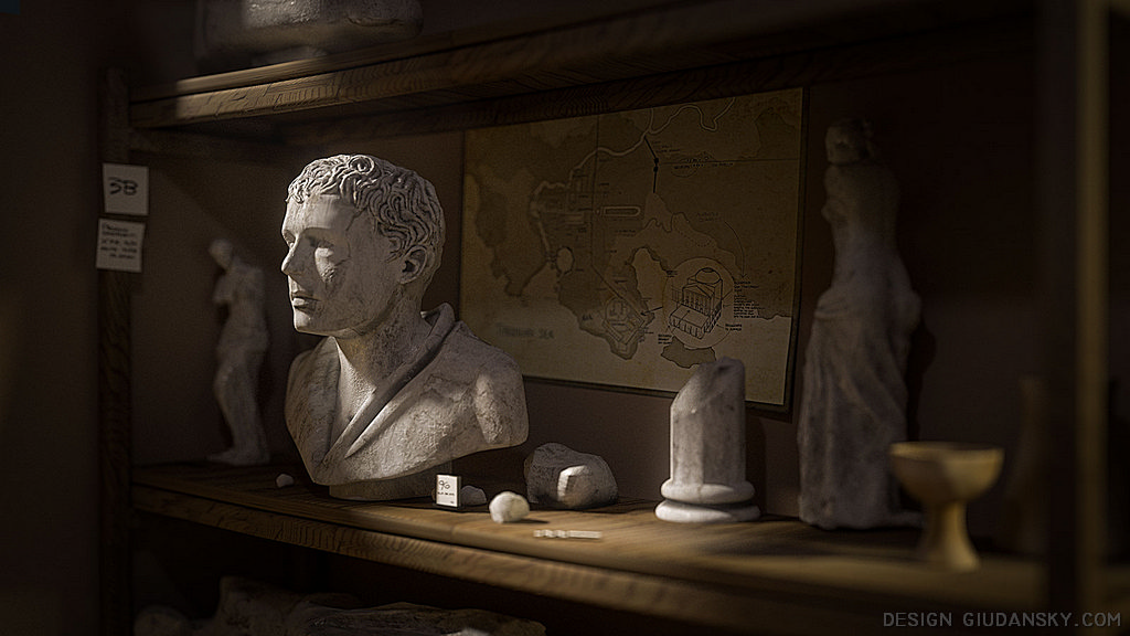 Il tocco finale di un ambiente realistico è come al solito sui dettagli: gli scaffali sono impercettibilmente incurvati dal peso della pietra e i foglietti sono vere note a pennarello scansionate e appese sullo scaffale nel modello 3d. Un tocco di realismo meno imperiale del busto ma che contribuisce a trasmettere naturalezza e credibilità a tutta la scena.
