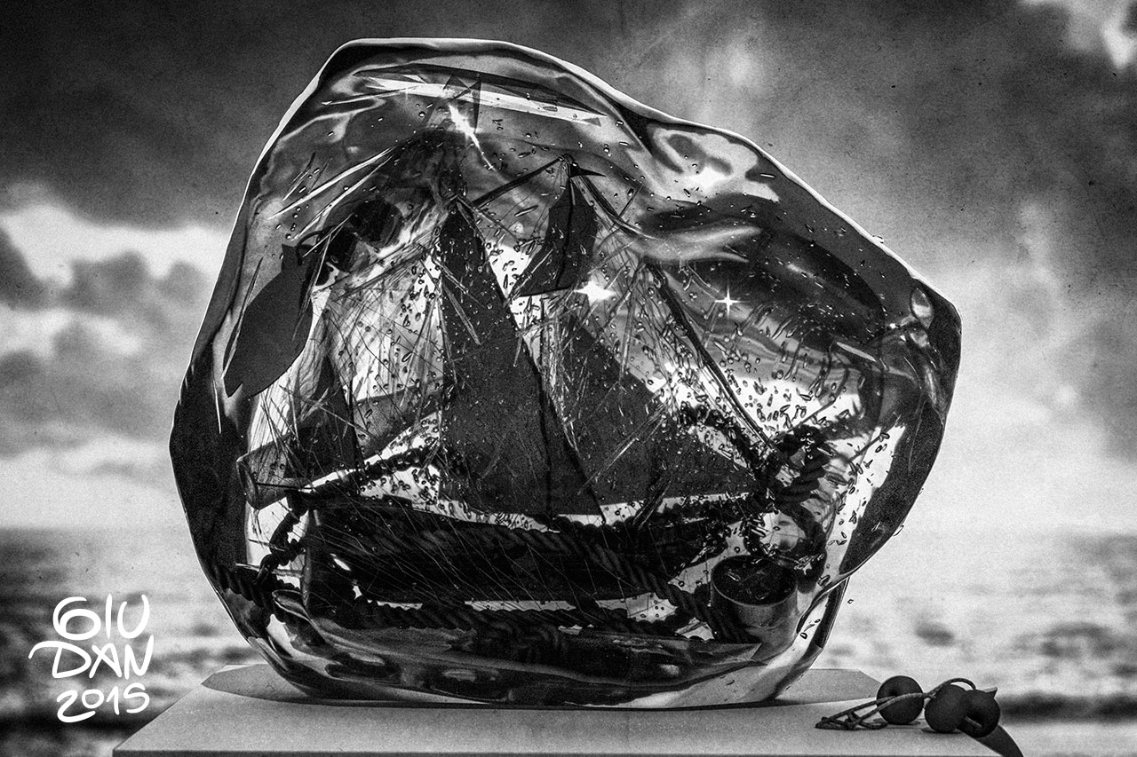 Composition updated with glasses, ropes, floats and other details. A curiosity: the crown floats is a real item I brought from Ciclades islands, Greece. A white plastic fish shape attached to a pair of floating balls used to attract shoals.
