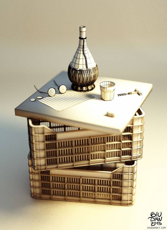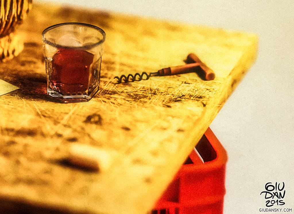 O tavolo improvvisato. This CGI stillife assembled some typical wine elements in a simple and rustic atmosphered environment. Colored plastic boxes used for the grape harvest are very familiar in the Italian country so it is the old flask of wine covered with straws, the flat-cut sides glasses and the wooden T shaped bottle opener. All the objects fits in the stillife trying to tell a story.