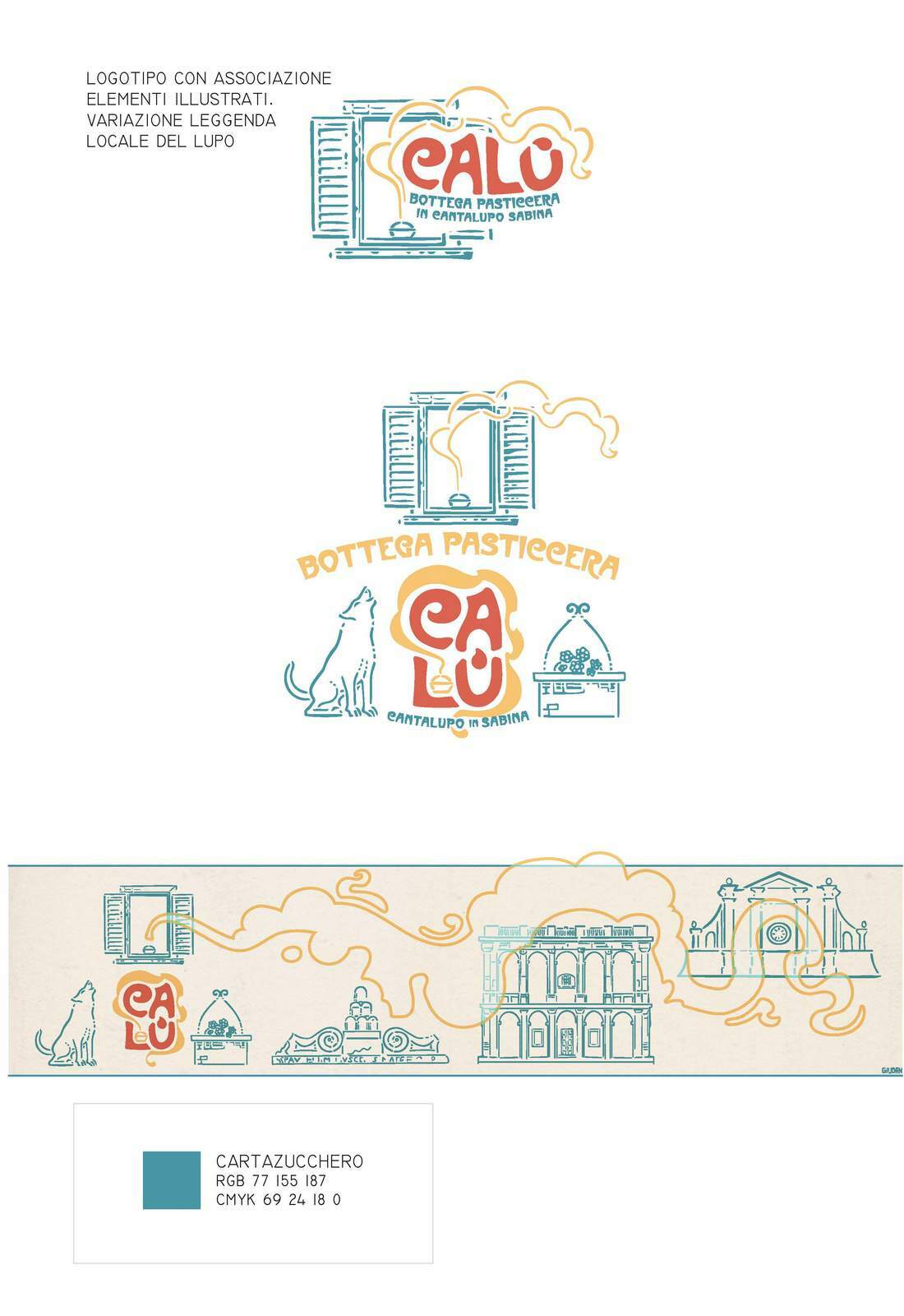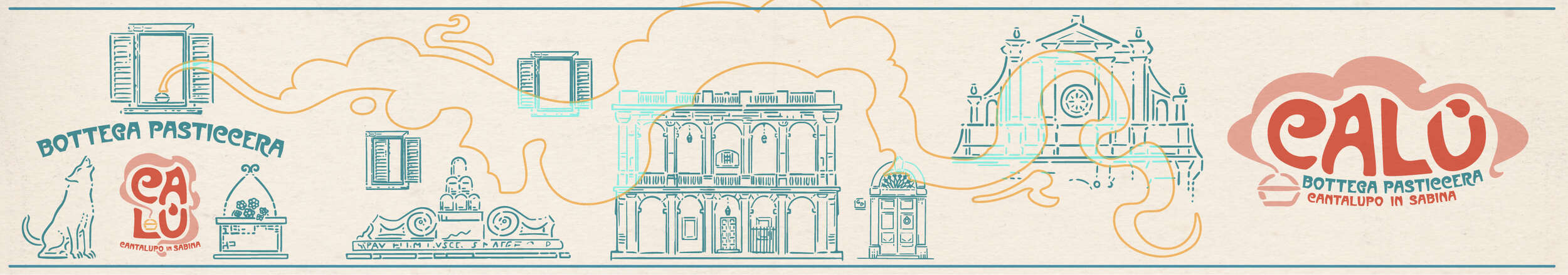 The work is inspired by the classic signs of the past (french and italian) and is presented by rewriting the local legend of the town: in the Sabine countryside a wolf was wandering around hungry howling in the surroundings; he saw a bright star in the sky and his mournful howl turned into a harmonious song. The tissue paper coordinated with the brand tells the same story, but the hungry wolf (which is also on the coat of arms of the town), guided by a cloud of fragrant scent of sweets that cloaks the alleys of the village, arrives under the window where a freshly baked cake has been placed. That window recalls the place in the small square where the Calù pastry shop opens.