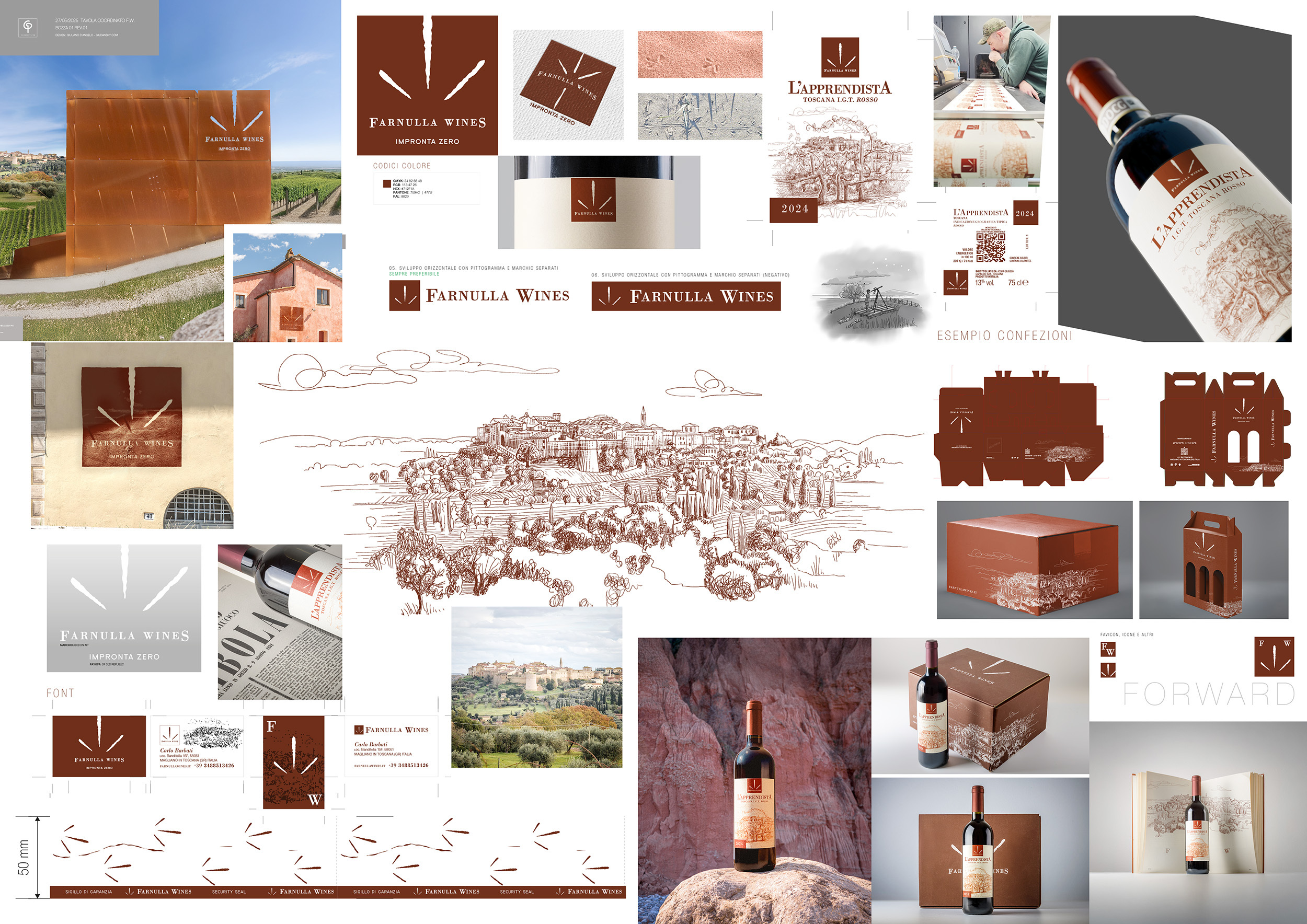 This board brings together the best of the creative journey we followed in developing the full coordinated image for the Farnulla Wines brand. From the creation of the logo and payoff, to the color and format variations, the packaging, the label for the first wine, and the application of the brand identity on the architectural elements of the new winery.