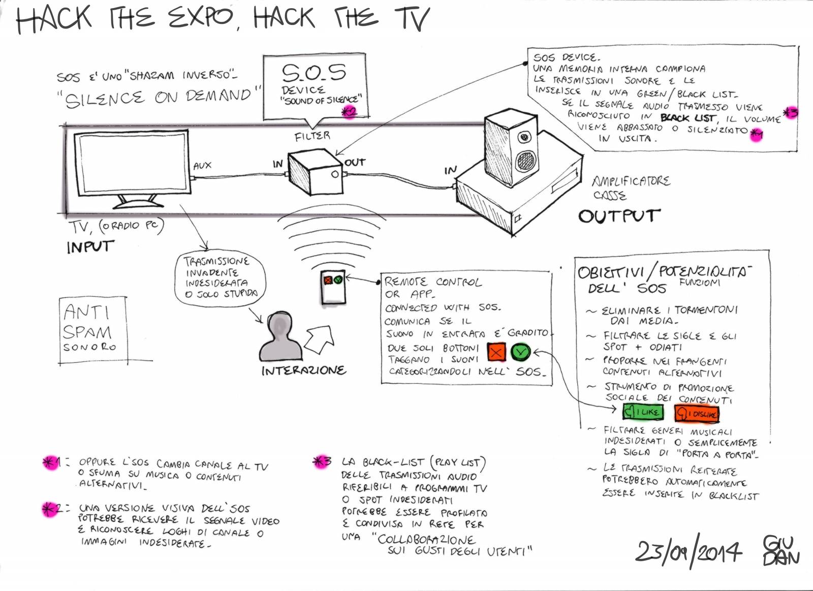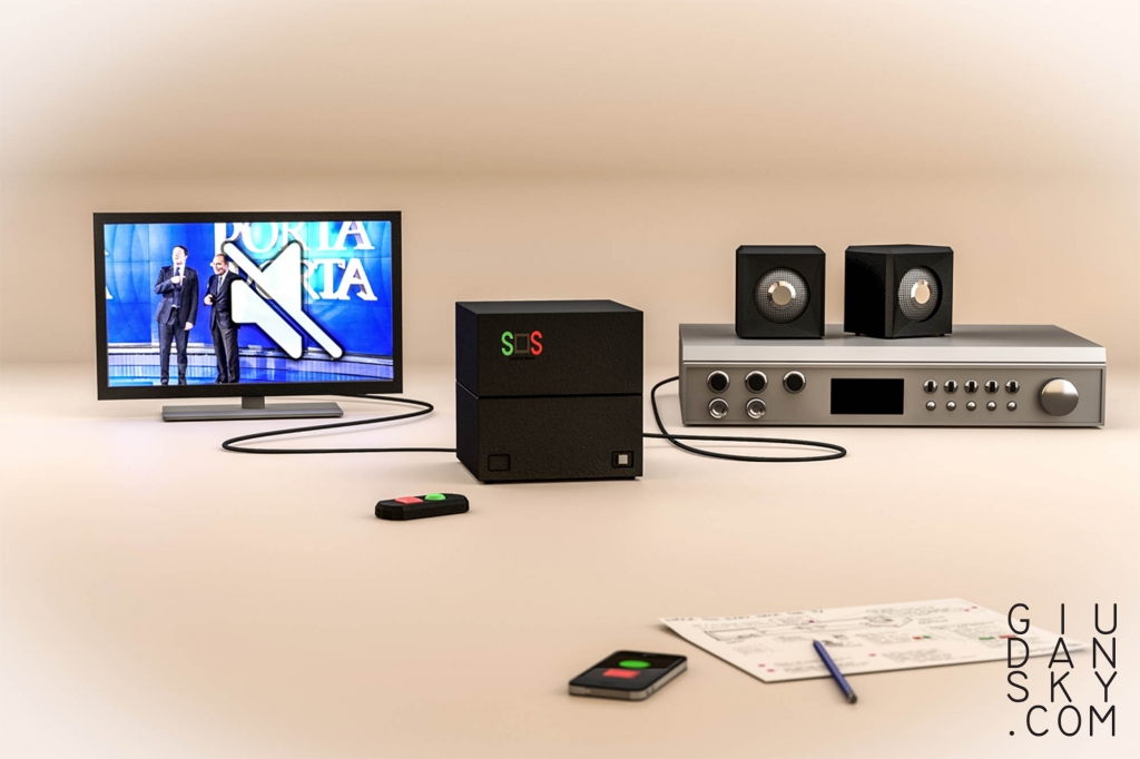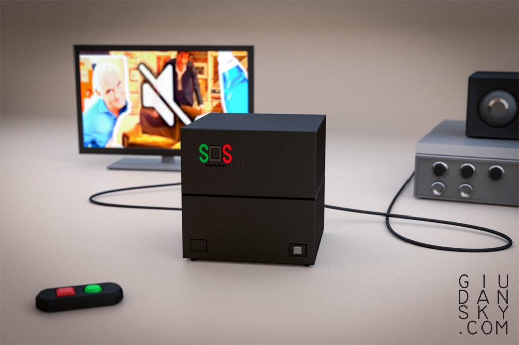 Il suo nome chiarisce meglio la sua funzione: "S.O.S. Sound of Silence" Silence on demand. Si tratta di un dispositivo con entrata e uscita Hdmi da montare tra la TV e le casse/amplificatore. L'SOS ha al suo interno un disco fisso e una cpu in grado di campionare le frequenze audio, taggarle e categorizzarle.