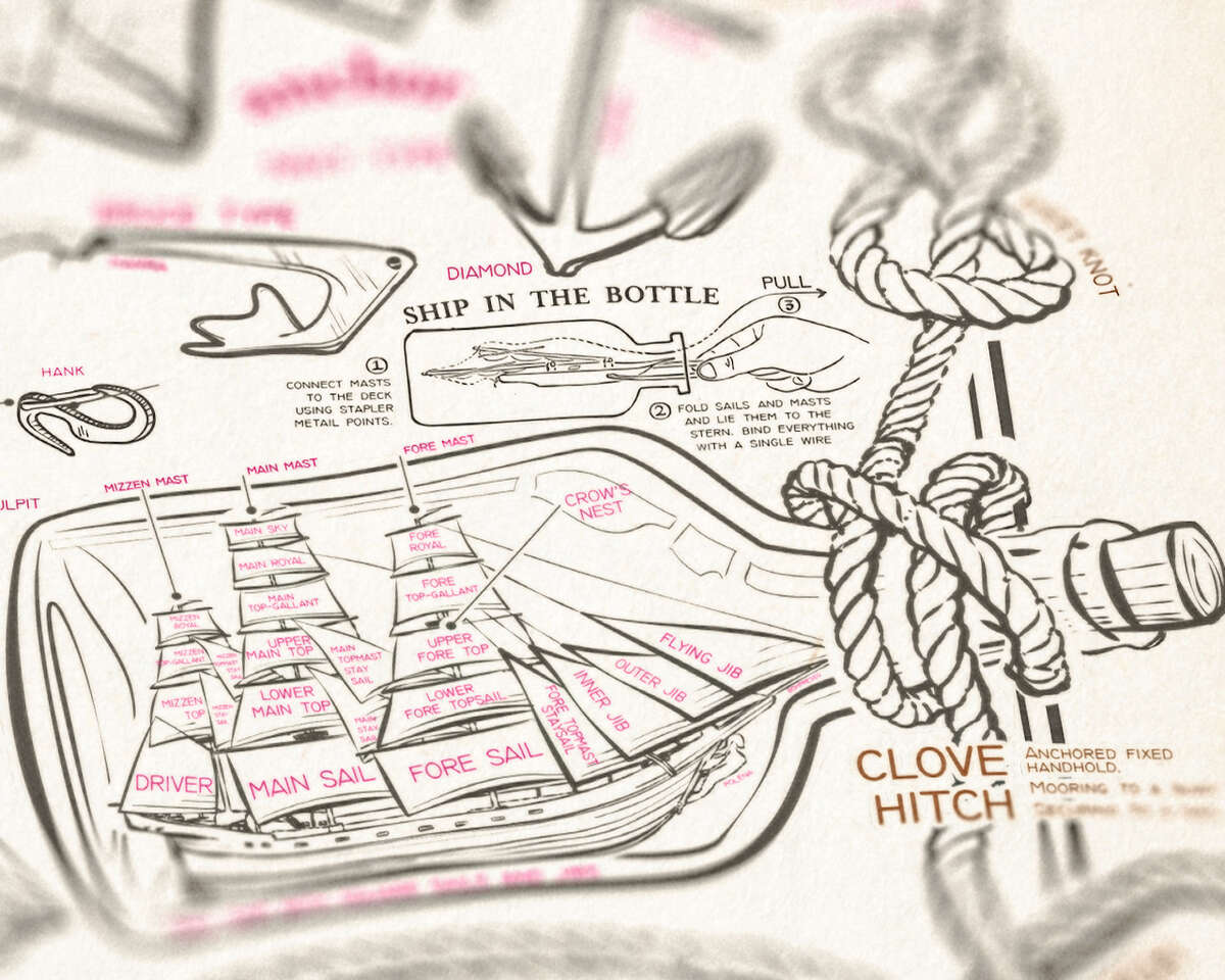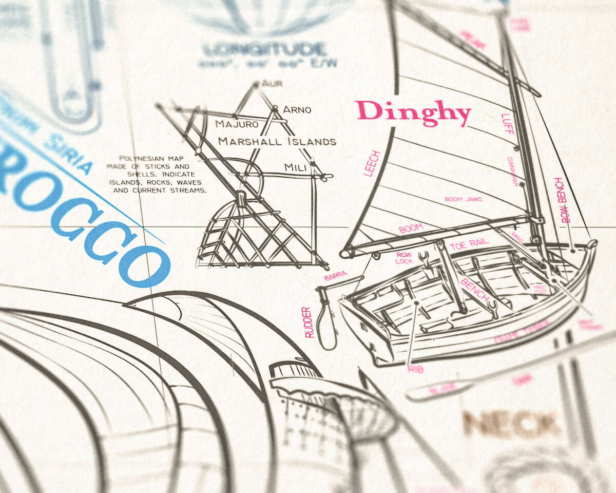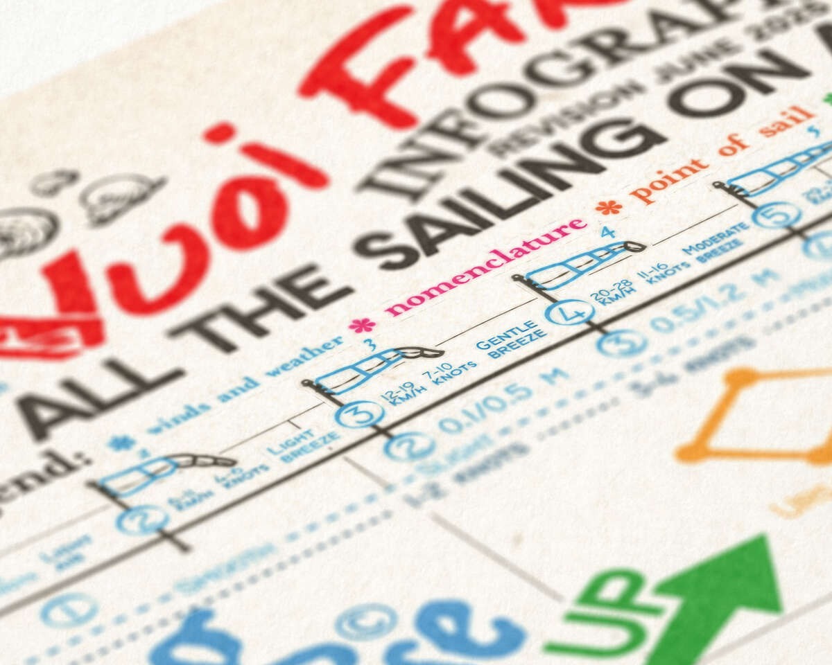 All the sailing theory on a single poster infographic. Hand drawn elements and line traced 3d object. Vector graphic + raster map overlay.
