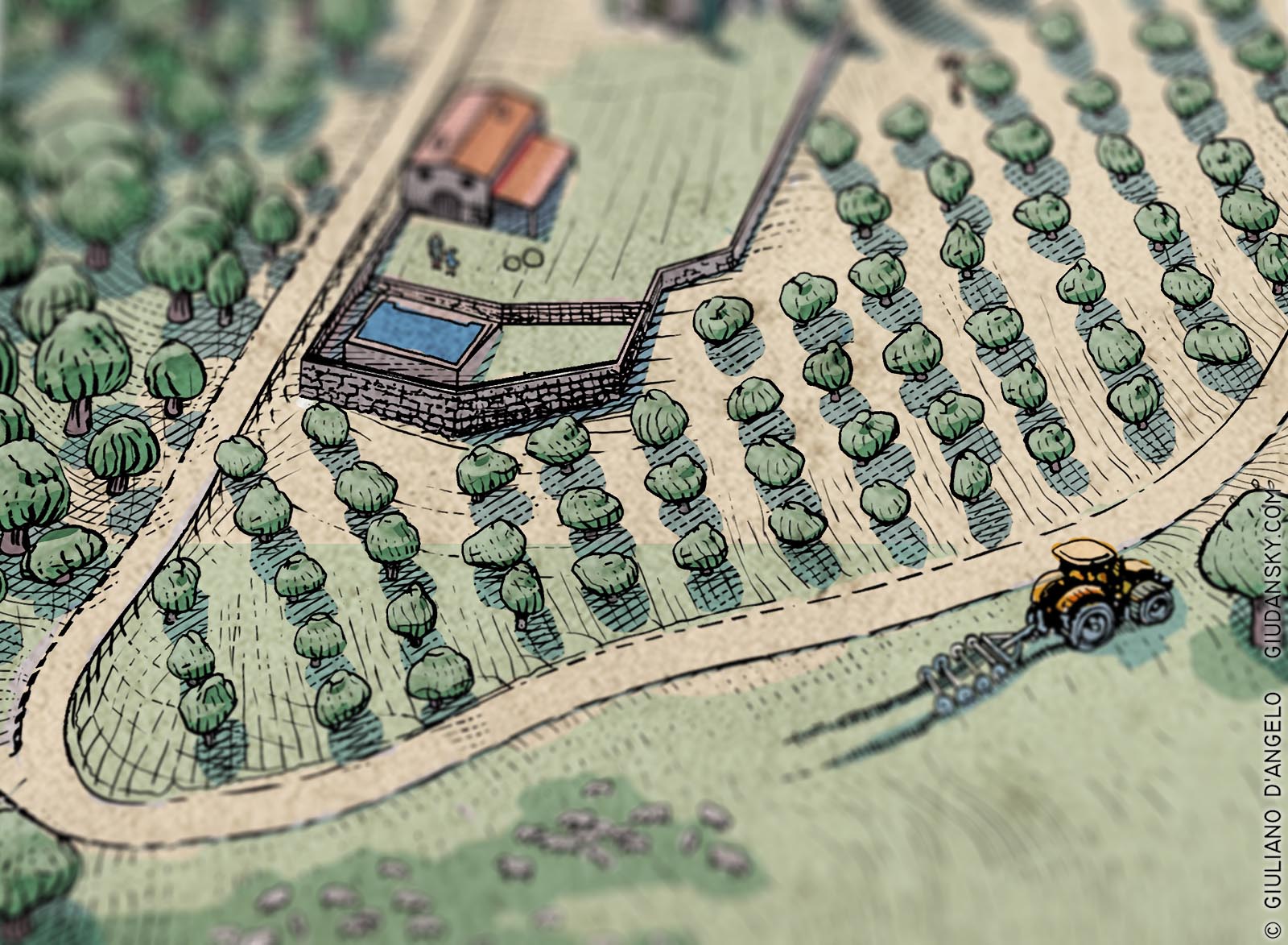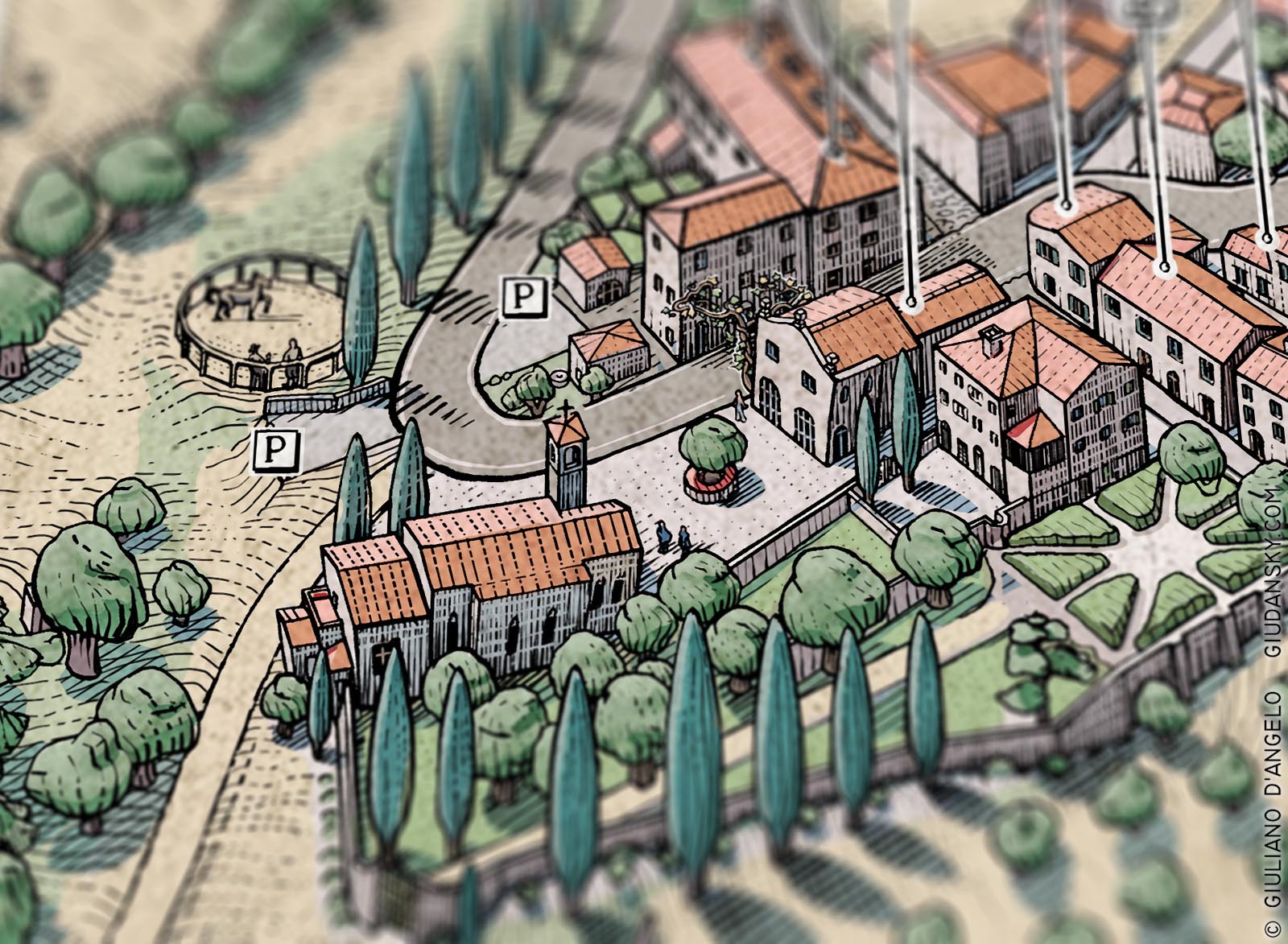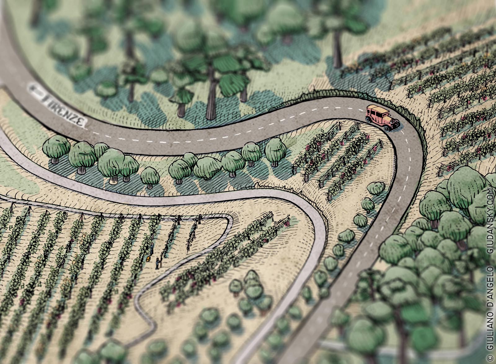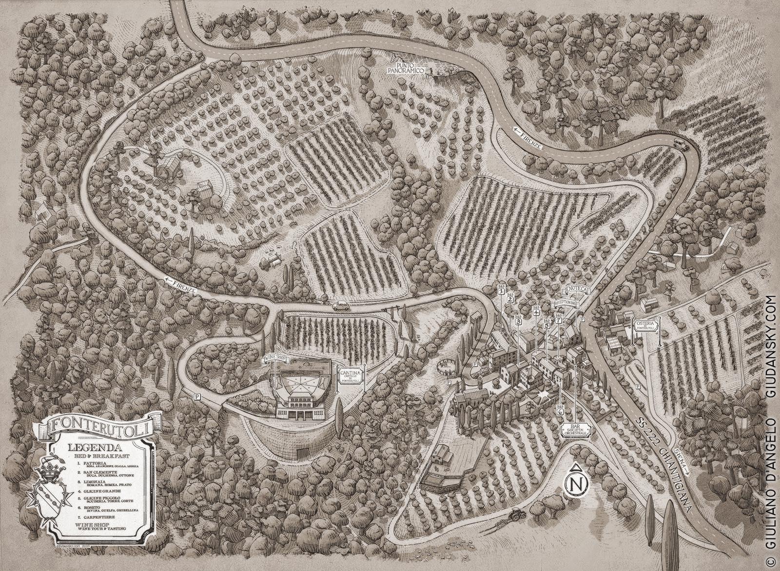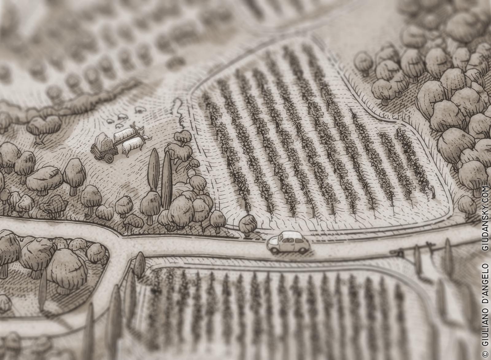 Castello di Fonterutoli Mazzei is a farm of incredible beauty, immersed in the Sienese Tuscany. Drawing an illustrated map of this place means knowing every corner, flying like a falcon over every single roof of the village, following the direction of the vineyards plots that climb up the mountain. Drawing the stones details of the ancient walls, it is inevitable to take a journey through time imagining its history. When the work is finished, it is like feeling at home and orienting yourself as if you had lived there for a long time.