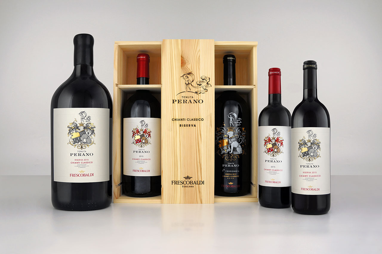 Sulle etichette del gruppo Frescobaldi per la prima volta compare lo stemma della famiglia, con il leone e la vela al vento segno distintivo dei commercianti dall'anno 1100.