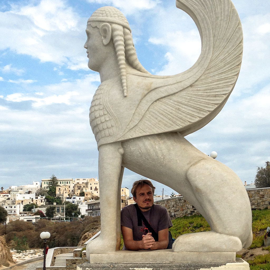 Una curiosa esperienza personale riguarda la sfinge. Poco tempo dopo aver lavorato agli elementi dell'illustrazione, in particolare alla modellazione della sfinge che ho realizzato scolpendola in 3d, mi è capitato di trovarla dal vivo sull'isola greca di Naxos: un'incontro emozionante. Modellare in 3d un oggetto ancor più che proiettarlo in una rappresentazione bidimensionale, significa comprenderlo in tutta la sua esistenza spaziale. Una comprensione più approfondita rispetto a qualsiasi altra tecnica. Trovate i miei rendering e i work-in-progress dell'illustrazione a questa pagina.